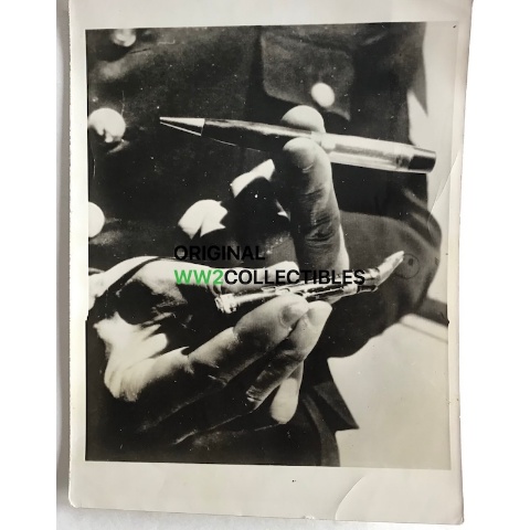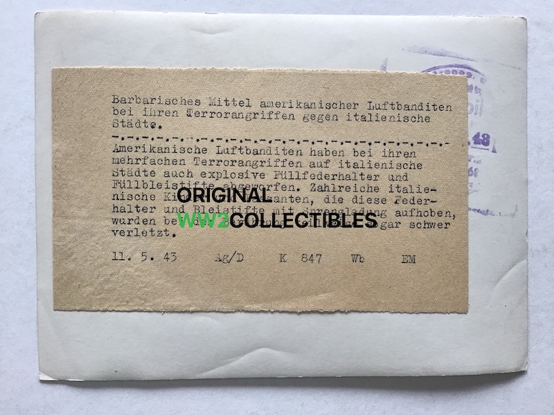 Original press photo of explosives in the form of pens etc., which according to the text on the reverse, were supposedly dropped by the Americans over Italy.