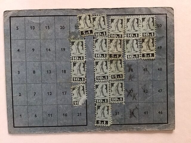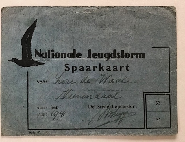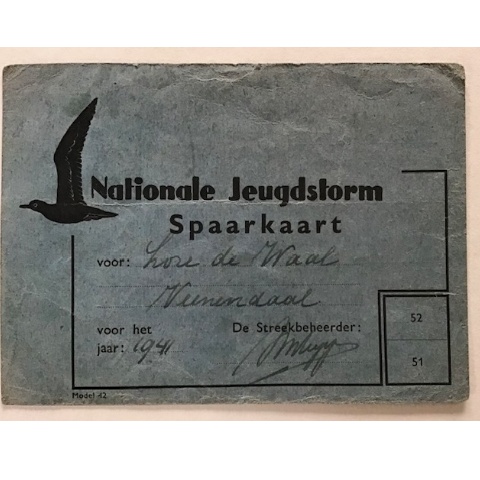 Completed contribution card from Veenendaal featuring 1941 membership stamps of the Dutch Youth Storm movement.