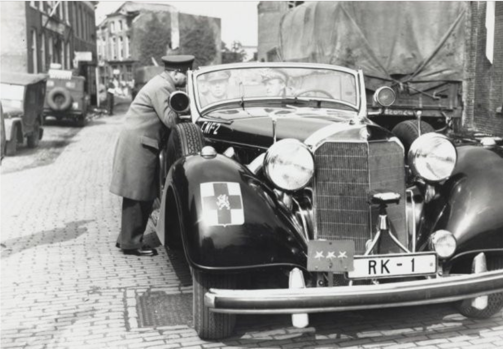 The car—a Mercedes-Benz Typ 770K—was part of the Reichskommissariat fleet. Seyss-Inquart, along with members of his entourage, reportedly took shelter nearby due to ongoing air raids before continuing westward later that evening.