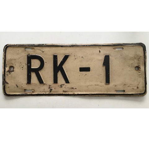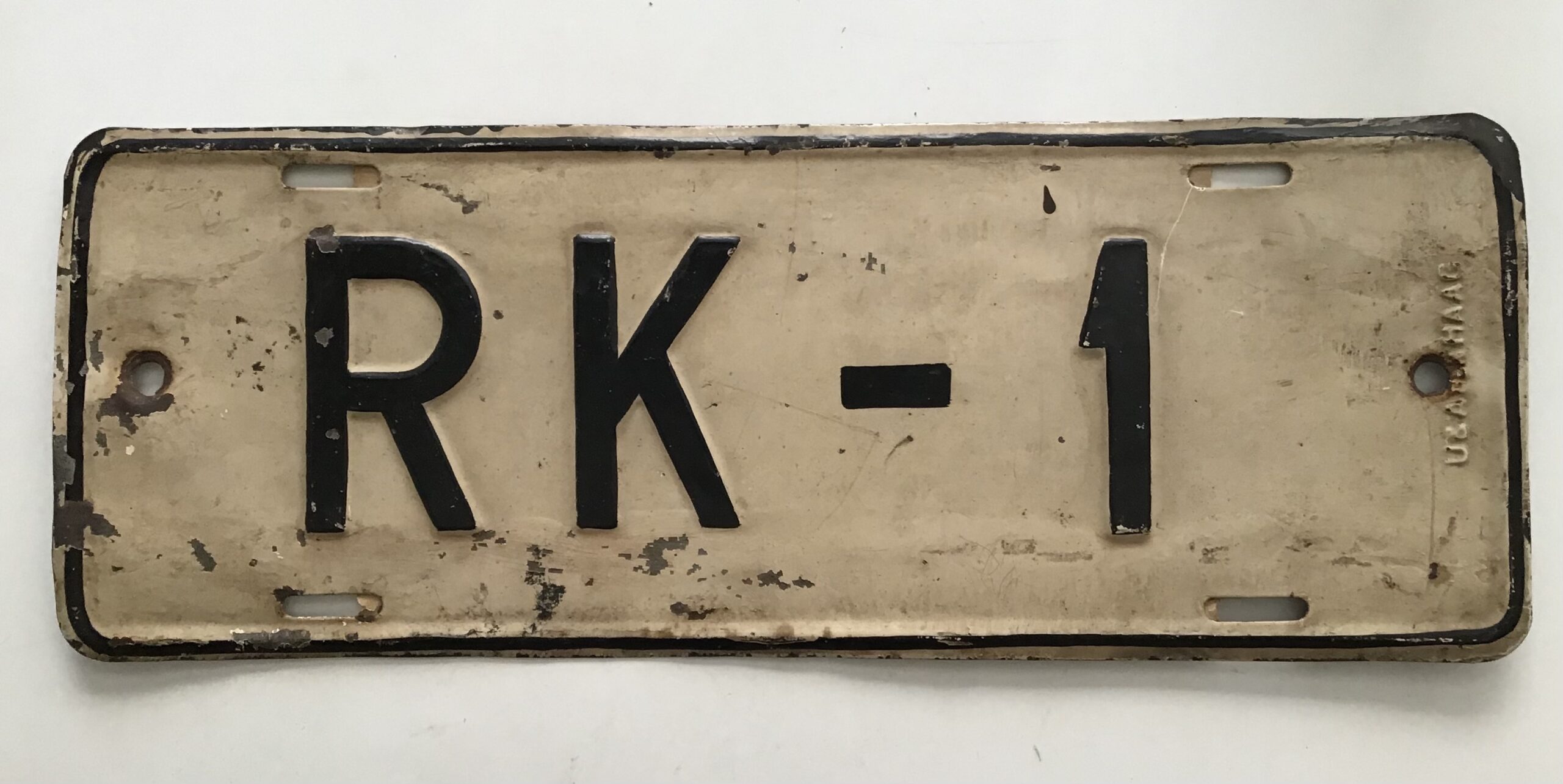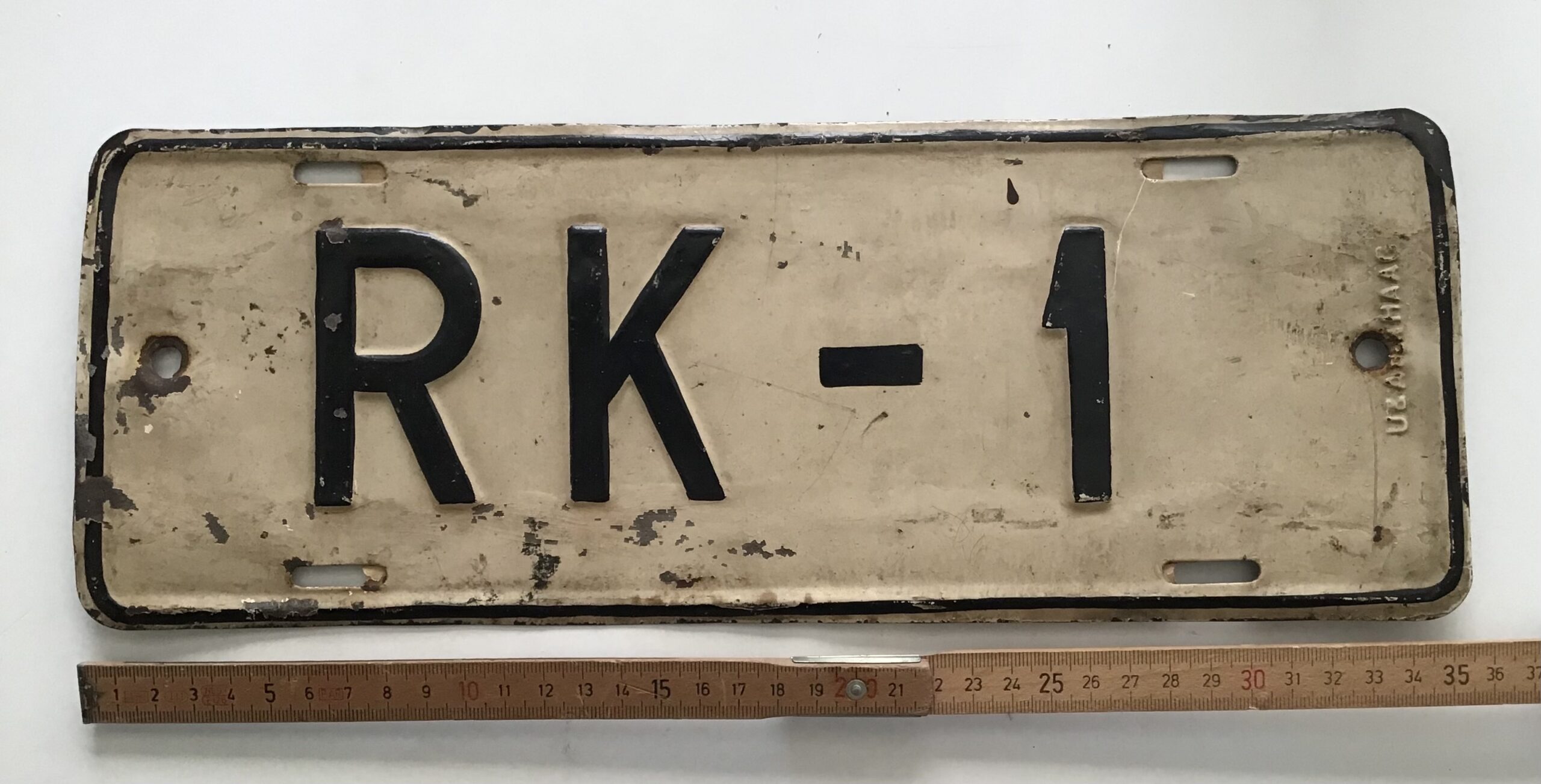 Original RK 1 number plate from the car of Reichskommissar Dr. Arthur Seyss-Inquart, recovered near Oud-Millingen on April 8, 1945, one day after the vehicle was destroyed by British fighter aircraft.