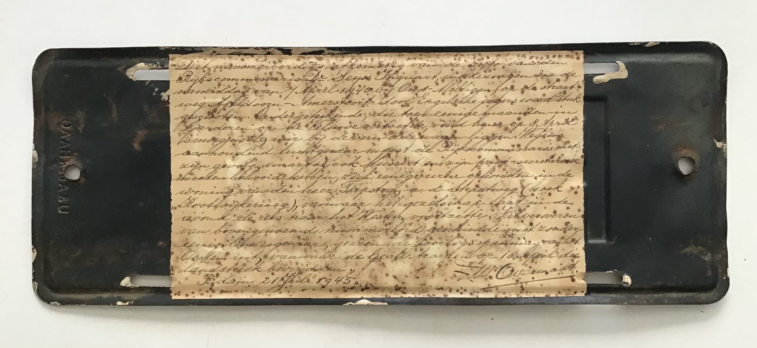 This number plate comes from the car of Reichskommissar Dr. Seyss-Inquart, which was shot up by British fighter planes on the afternoon of April 7, 1945, near Oud-Millingen on the Apeldoorn–Amersfoort road. The undersigned, who had been staying in Garderen on the Veluwe for several months, found it on the morning of April 8 around 9 a.m., lying near the wrecked vehicle.