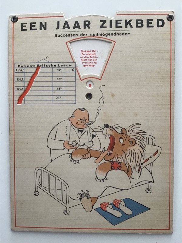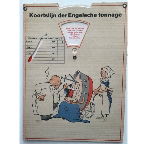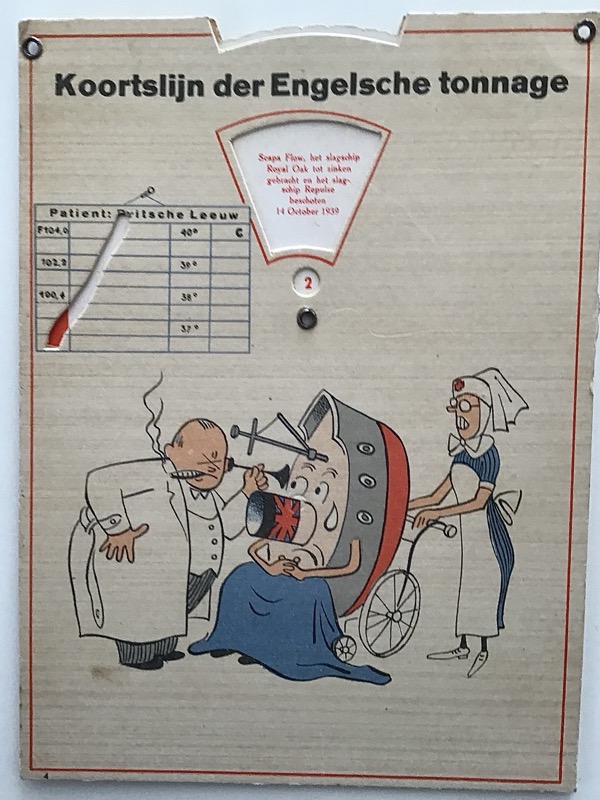 A rare novelty card featuring a rotating mechanism indicating how “ill” the British lion is, representing the losses suffered by Britain against Germany.