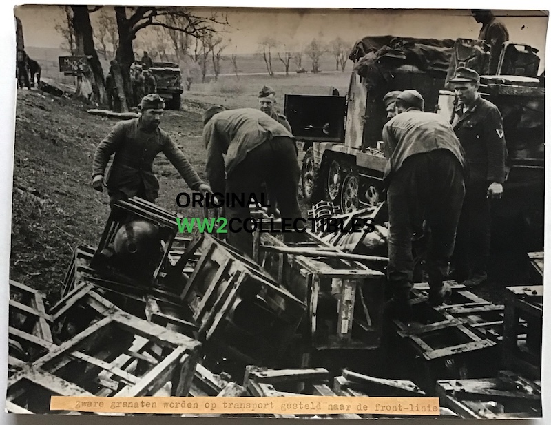 Heavy shells are being loaded onto terrain vehicles (Kettenfahrzeug) to be transported to the front.