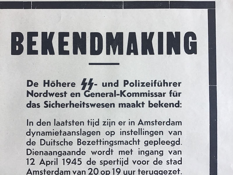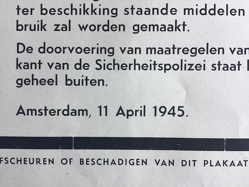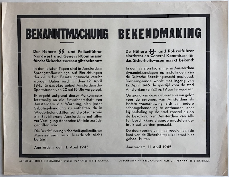 This time the warning to the citizens of AMSTERDAM comes from the HÖHERE SS - und POLIZEI Führer to refrain from committing sabotage and to remain calm. Confusing text. Naturally, the announcement ends with threats.