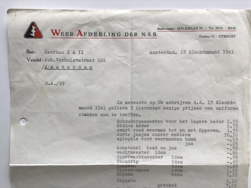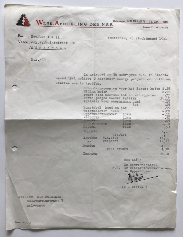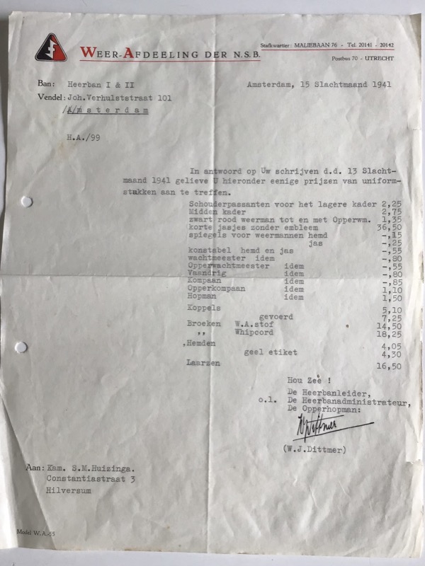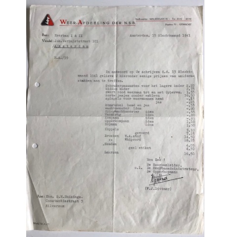 Typed letter with a price quotation for WA clothing items.Addressed to the administrator of the municipality of Hilversum.