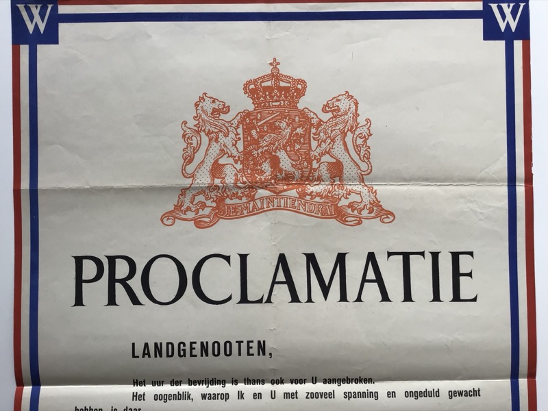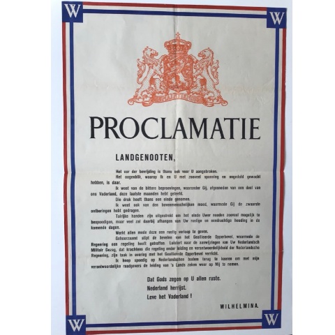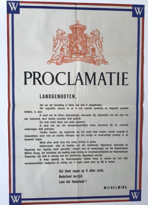 Original proclamation of Queen Wilhelmina announcing the liberation. She calls on the population to strictly follow the instructions of the Allied High Command and also states that she will soon return to the Netherlands.